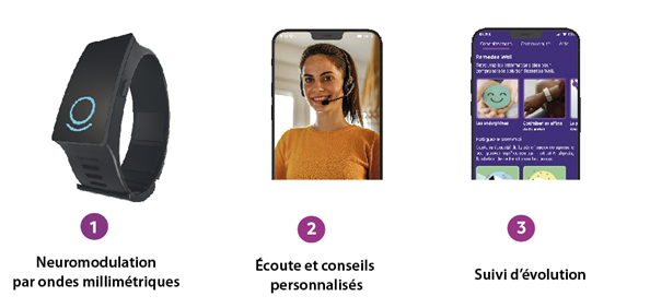 « Émises à une fréquence de 60 GHz, les ondes millimétriques pénètrent dans la couche superficielle de la peau (moins de 0,5 mm) et viennent stimuler les terminaisons nerveuses sous-cutanées, ce qui entraîne une augmentation de la production d’opioïdes endogènes intracérébraux (endorphines), mais aussi d’autres neuromédiateurs (dopamine, sérotonine). Cela permet d’agir sur la sensation de douleur, mais aussi d’agir sur la qualité de vie globale (sommeil, anxiété, humeur…) » nous explique Dr David CROUZIER (PhD), cofondateur et Directeur Général de Remedee Labs.